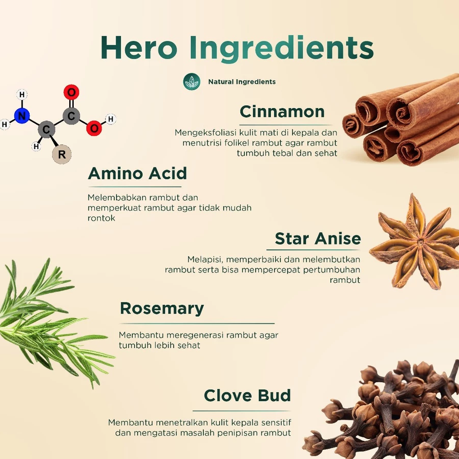 Gunakan secara rutin dan maksimalkan penggunaannya dengan Hot Oil Hair & Scalp Treatment sebelum keramas, dan Cinnamon & Amino Acid Mild Shampoo sebelum penggunaan conditioner.