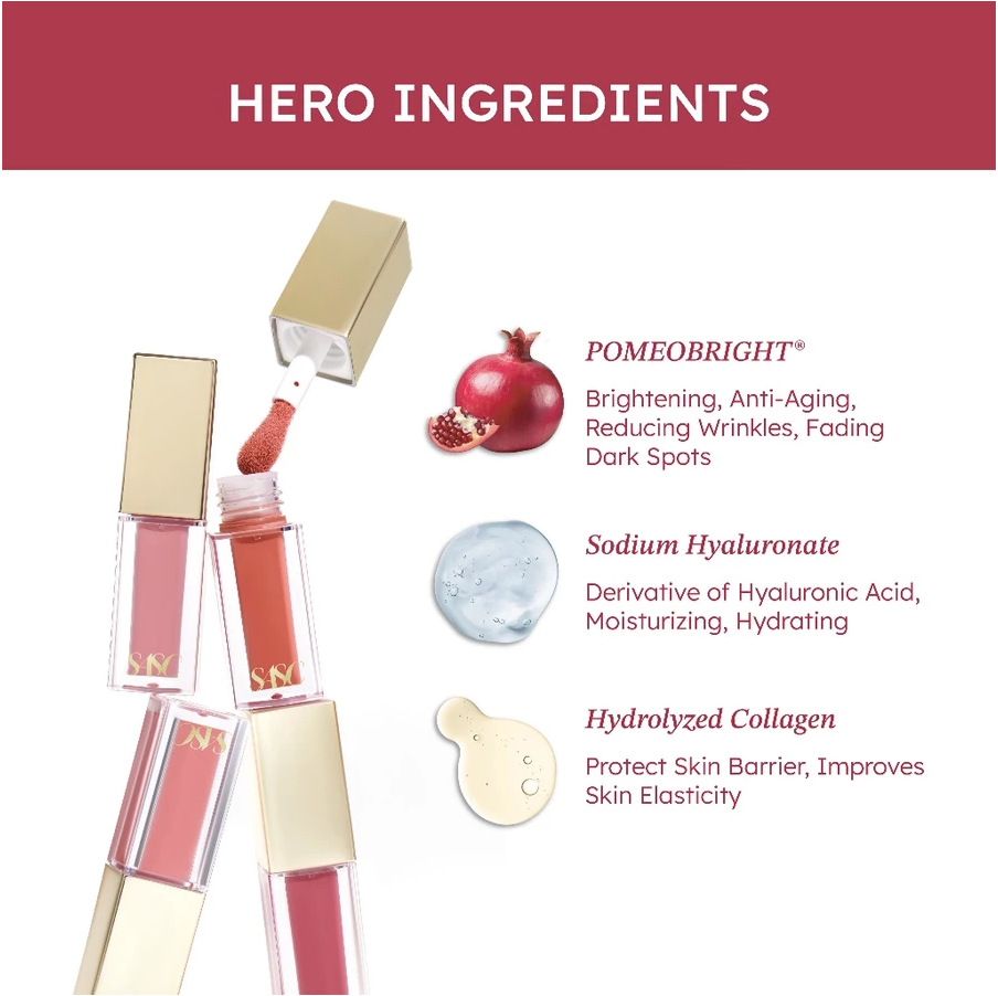 Isododecane, Hydrogenated Polydecene, Trimethylsiloxysilicate, Cera Microcristallina, Lauryl PEG-10 Tris (Trimethylsiloxy) Silylethyl Dimethicone, Phytosteryl/Octyldodecyl Lauroyl Glutamate, Dextrin Palmitate/Hexyldecanoate, Dimethicone, Diphenyl Dimethicone, Disteardimonium Hectorite, C30-45 Alkyl Dimethicone, Phenoxyethanol, Propylene Carbonate, Mica, Simmondsia Chinensis Seed Wax, Helianthus Annuus Seed Wax, Water, Silica, Ethylhexyl Methoxycinnamate, Tocopheryl Acetate, Fragrance, Glycerin, Pentaerythrityl Tetra-di-t-Butyl Hydroxyhydrocinnamate, Talc, Acacia Decurrens Flower Wax, Methicone, Ricinus Communis Seed Oil, Punica Granatum Pericarp Extract, Sodium Hyaluronate, Hydrolyzed Collagen, Chlorphenesin, Hydrogenated Castor Oil.