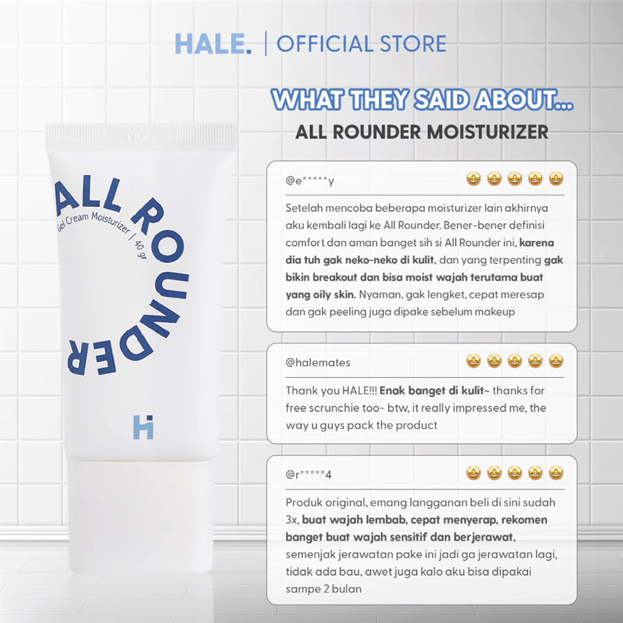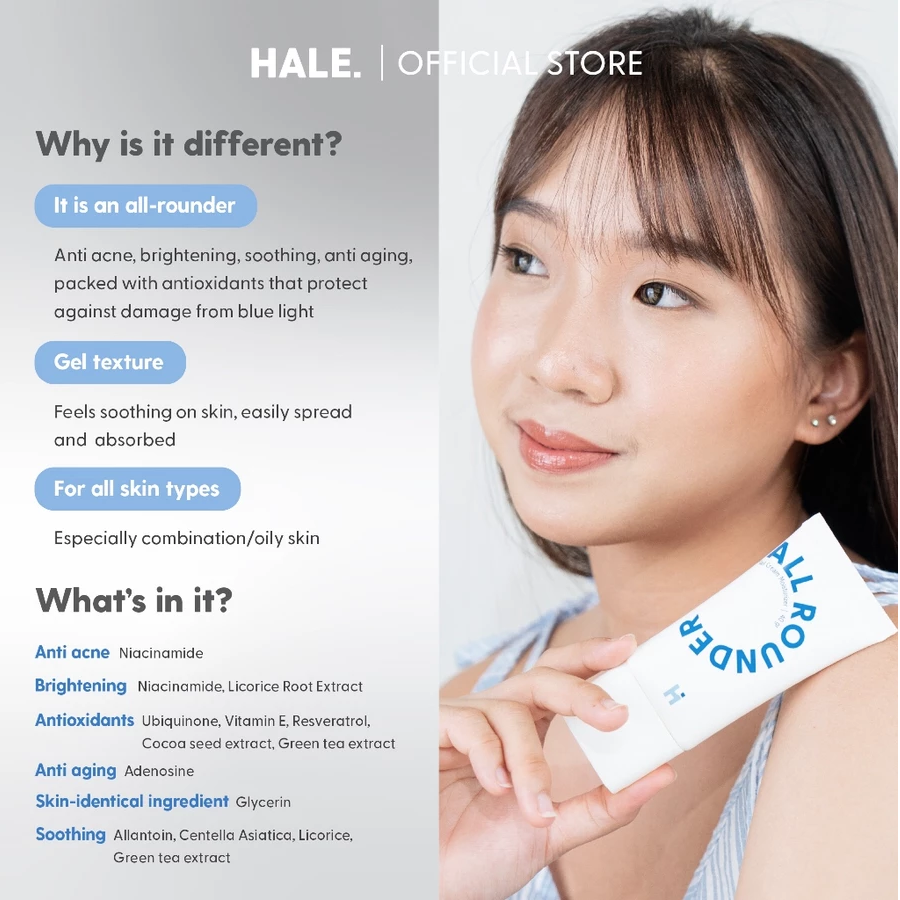 HALE All Rounder Gel Cream Moisturizer adalah pelembap wajah bertekstur gel-cream yang memberikan hidrasi tahan lama sekaligus bekerja sebagai produk multifungsi: anti-acne, brightening, soothing, anti-aging, dan antioksidan.
