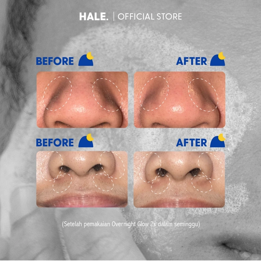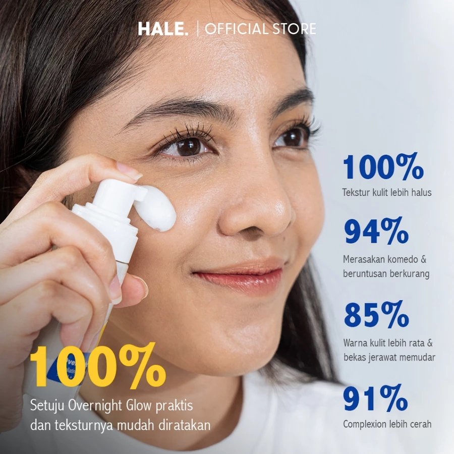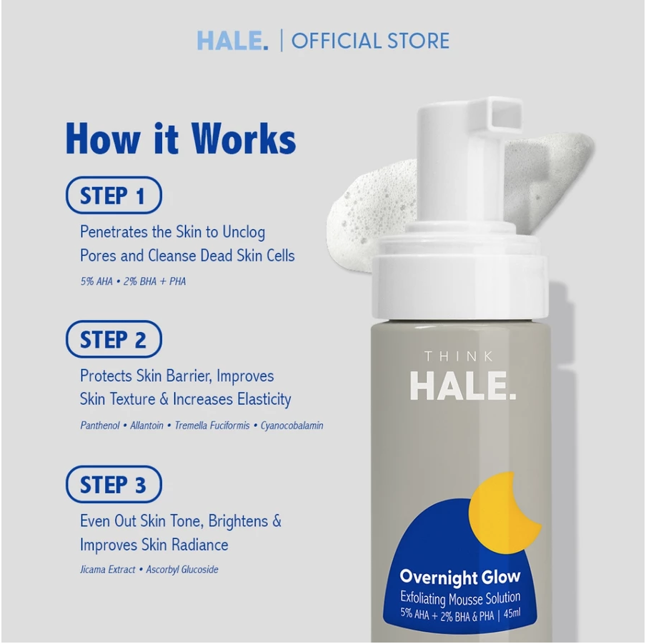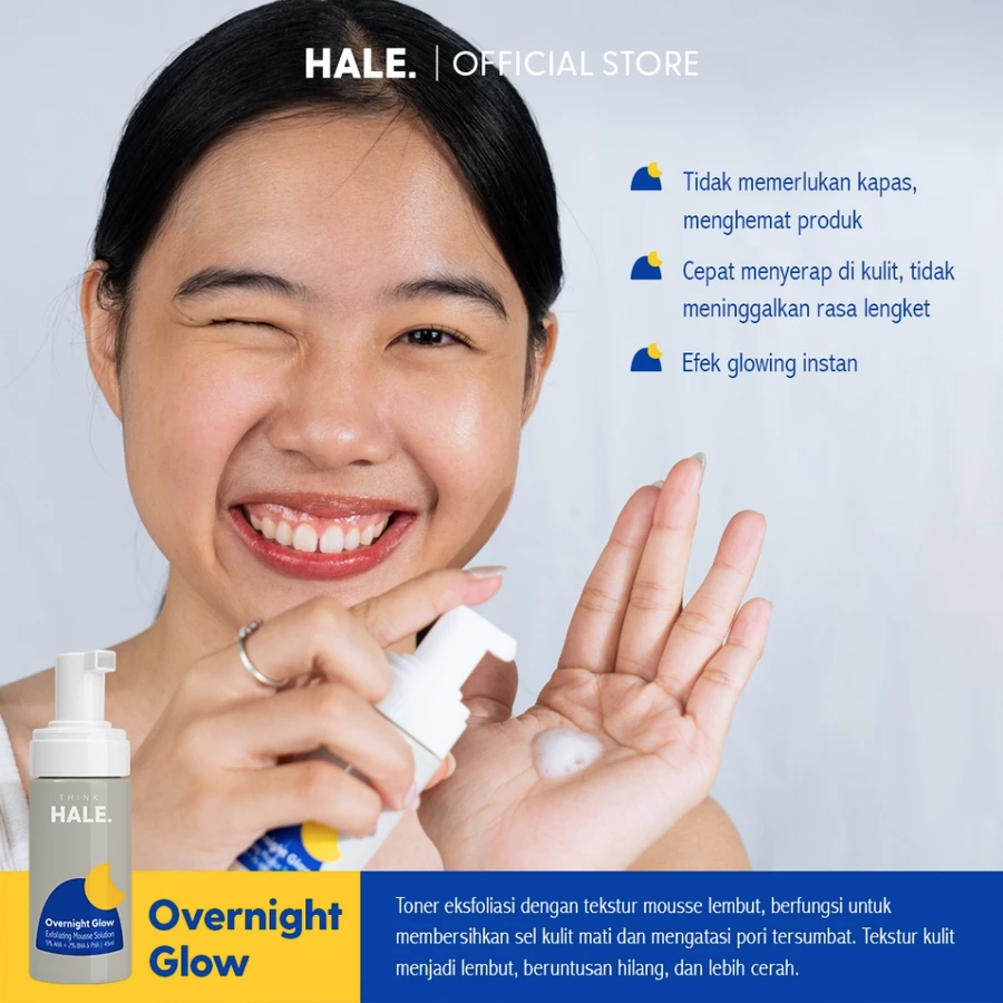 HALE Overnight Glow adalah exfoliating toner bertekstur mousse dengan kombinasi 5% AHA dan 2% BHA & PHA untuk membantu mengangkat sel kulit mati, membersihkan pori-pori, serta memperbaiki tekstur dan kecerahan kulit.