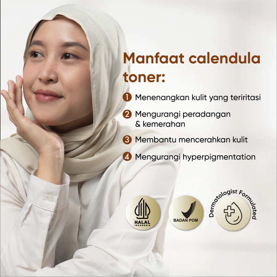 – Calendula Extract untuk membantu menenangkan kulit yang teriritasi, mengurangi peradangan, iritasi, dan mempercepat repitalisasi kulit