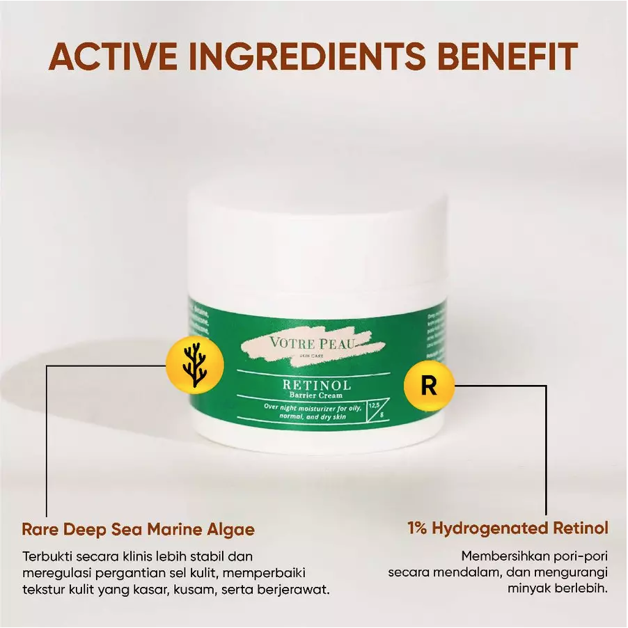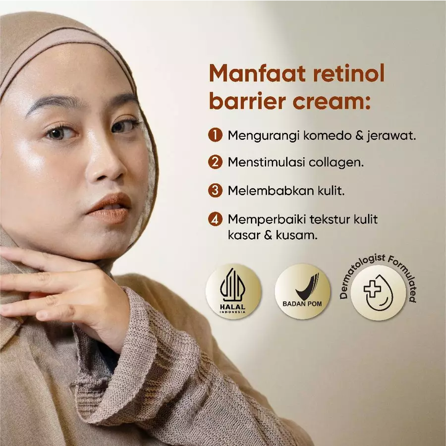 Retinol Barrier Cream dengan Marine Algae merupakan produk anti jerawat dan anti-aging yang ampuh untuk mengencangkan kulit, mengurangi kerutan halus, melembapkan, dan membersihkan wajah dari komedo dan jerawat. Retinol merupakan Gold Standard dalam pengobatan jerawat dan kerutan halus.