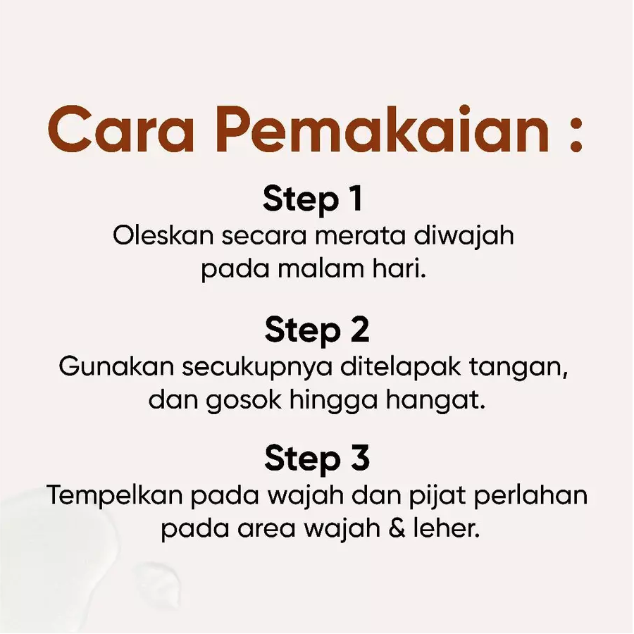 Cara Pakai 2 : Ambil Retinol Barrier Cream secukupnya ditelapak tangan, lalu gosok ke dua telapa tangan hingga Retinol dirasa menghangat. Tempelkan dan pijat telapak tangan ke area wajah dan leher.