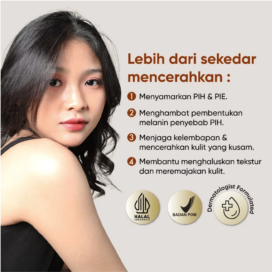 Kombinasi rangkaian bahan aktif dalam format serum yang tidak hanya mencerahkan, namun membantu untuk memperbaiki tekstur kulit, mengangkat sel kulit mati dengan lembut, dan memberikan hidrasi untuk kulit tampak glowing sehingga makeup jadi lebih mudah menempel dan tahan lama.